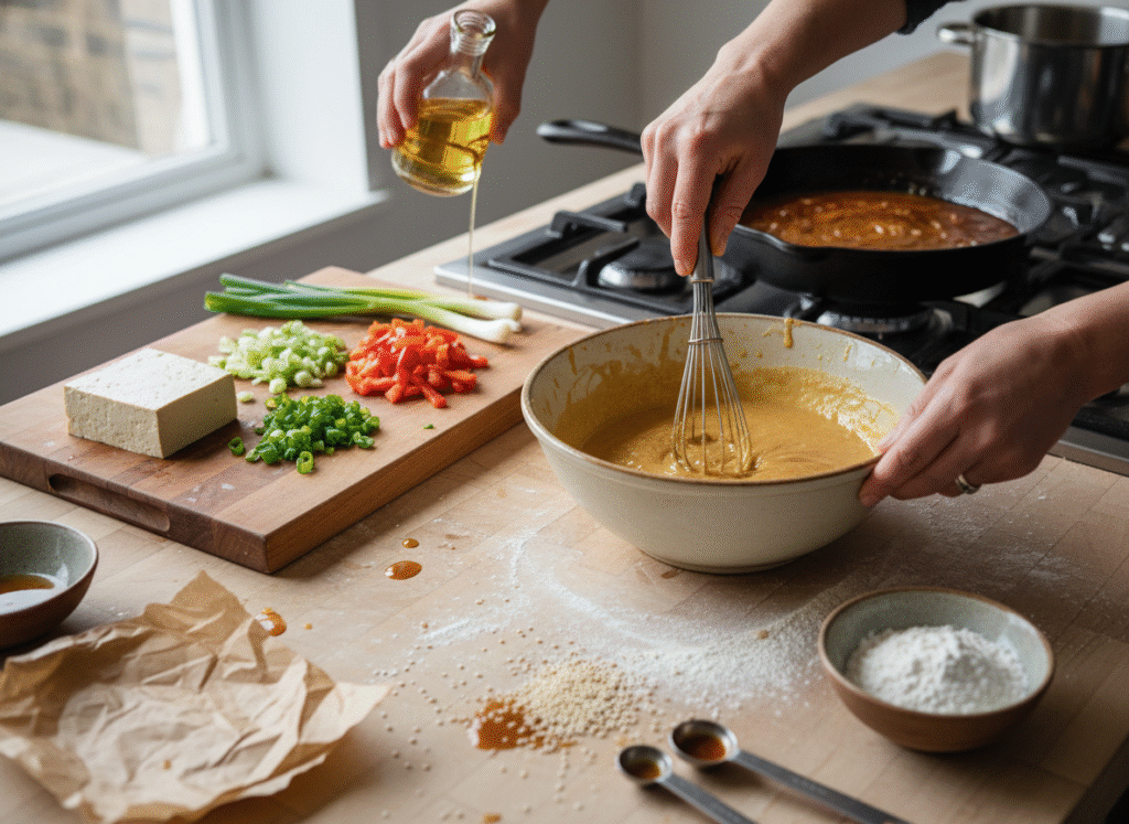 - Build and Thicken the Sauce (Step 4 of 5): Pour in the soy sauce, maple syrup, rice vinegar, sesame oil, and vegetable broth. Bring the mixture to a low simmer. Pour in the cornstarch slurry (1 tablespoon cornstarch mixed with 2 tablespoons cold water) while stirring constantly. The sauce will thicken immediately into a beautiful, glossy glaze.