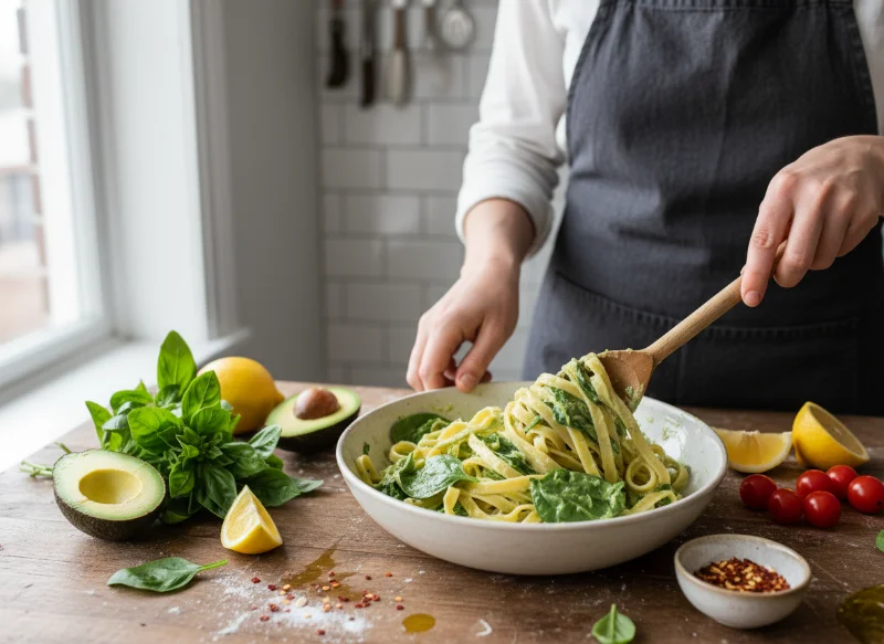2. No-Cook Efficiency: Because avocado is stable and creamy at room temperature, you don’t need to cook the sauce. You simply toss it with hot pasta, and the residual heat creates a velvety glaze.