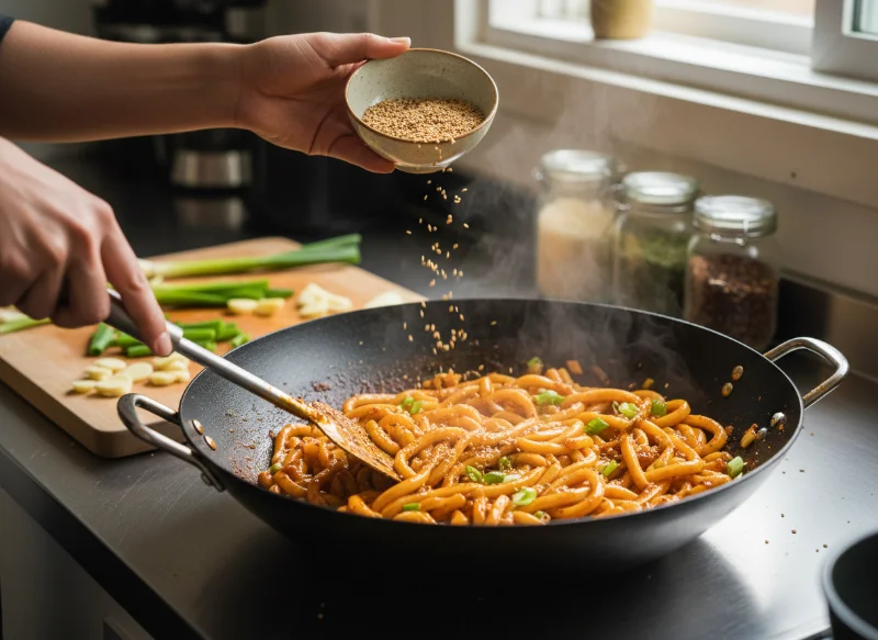 5. Garnish and Serve: Turn off the heat. Divide the noodles into bowls. Garnish heavily with sliced green onions, toasted sesame seeds, and a few chili threads or red pepper flakes if you want extra heat.