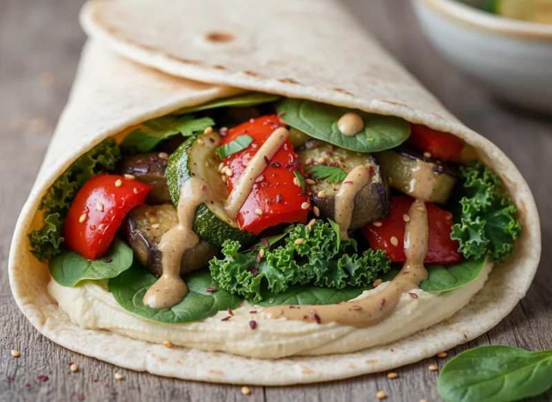 - Preventing Sogginess: The order matters! Hummus goes down first as the barrier. Greens go next. The warm/wet ingredients (roasted veggies) should go on top of the greens, not directly against the tortilla.