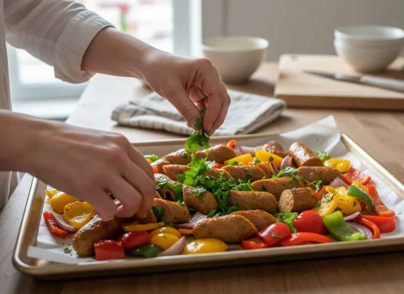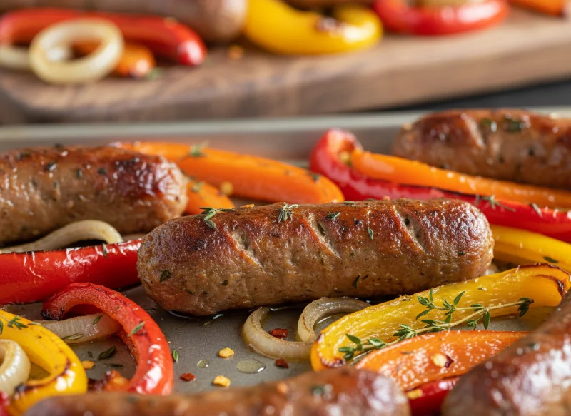 1. Maximum Flavor, Minimum Effort: Roasting peppers and onions concentrates their sugars, making them incredibly sweet and tender. When the vegan sausages roast alongside them, they develop a crispy “snap” on the outside and stay juicy on the inside.
