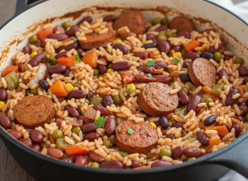 Traditionally, jambalaya relies heavily on andouille sausage and shrimp. In this plant-based version, we use smoky vegan sausage and red kidney beans to provide that same high-protein, hearty bite. The result is a meal that is spicy, savory, and incredibly satisfying.