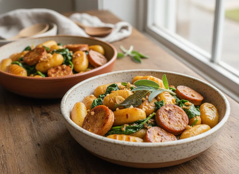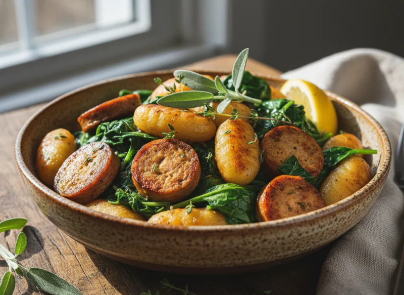 15-Minute One-Pot Vegan “Sausage” & Spinach Gnocchi: The “Pillow-Sear” Masterclass