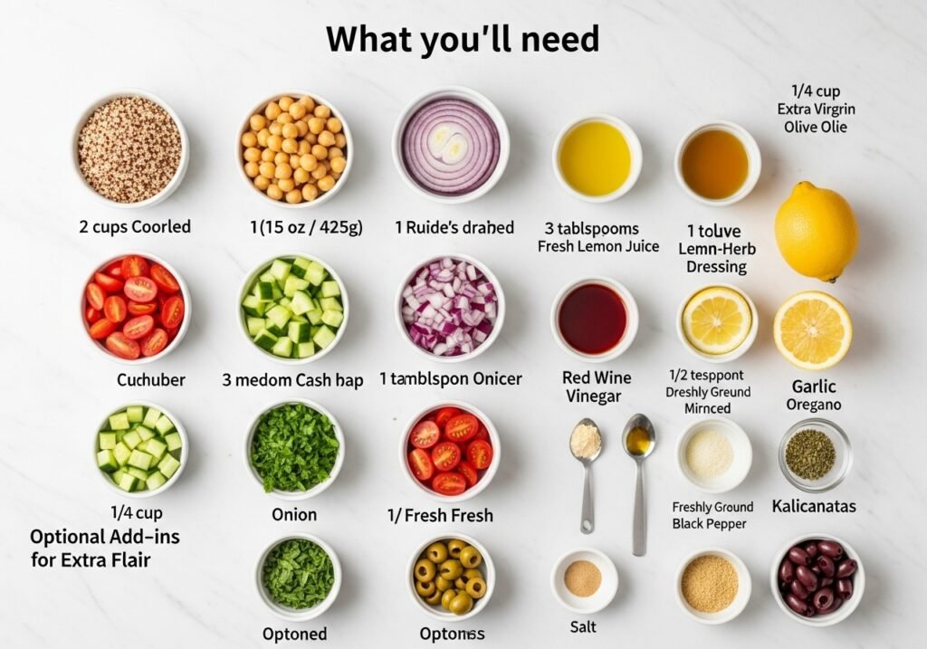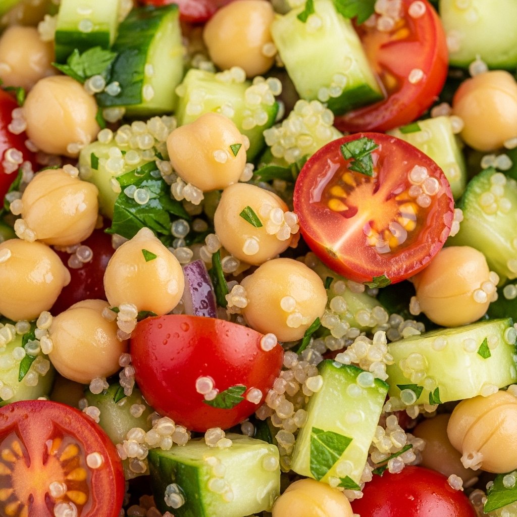 - Combine Salad (Step 4 of 4): In a large mixing bowl, combine the cooled cooked quinoa, rinsed chickpeas, diced cucumber, cherry tomatoes, red onion, fresh parsley, and mint. Pour the dressing over the salad and toss gently until all ingredients are evenly coated. Taste and adjust seasonings as needed.