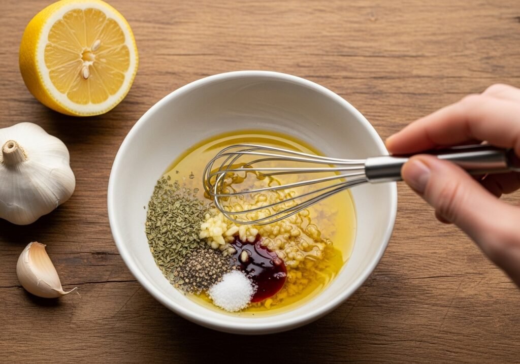 - Make the Dressing (Step 3 of 4): In a small bowl, whisk together the olive oil, fresh lemon juice, red wine vinegar, minced garlic, dried oregano, salt, and pepper until well combined.