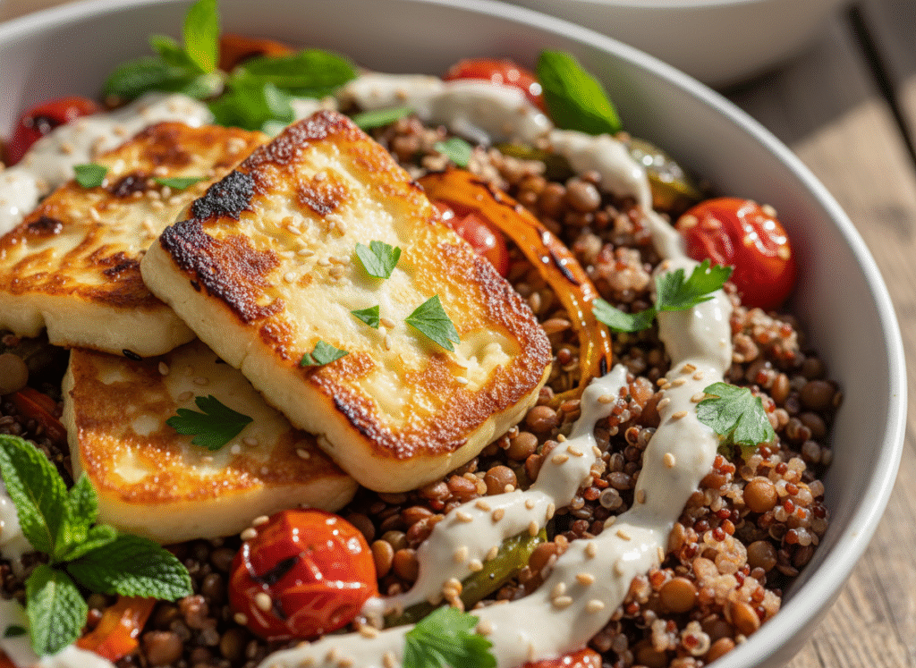 This bowl is the hero of High-Protein Vegan Recipes. It combines the “complete protein” power of quinoa with hearty chickpeas and a rainbow of fresh Mediterranean vegetables. Everything is tied together with a silky, zesty lemon-tahini dressing that makes every bite feel like a treat. Best of all? It’s a 20-minute vegan lunch that is incredibly budget-friendly, making it the perfect candidate for your Sunday meal prep routine.