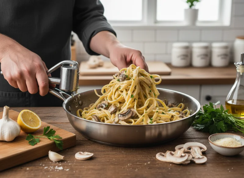 Instead of draining the pasta completely, we transfer it directly from the pot to the skillet with the mushrooms and garlic. The residual starch on the noodles, combined with a small amount of the cooking water, acts as a natural emulsifier. When this starch meets our plant-based cream (such as cashew or oat cream), it creates a physical bond that allows the sauce to cling to the pasta rather than pooling at the bottom of the bowl. This results in a silky, “Green Velvet” texture that provides maximum flavor in every bite.