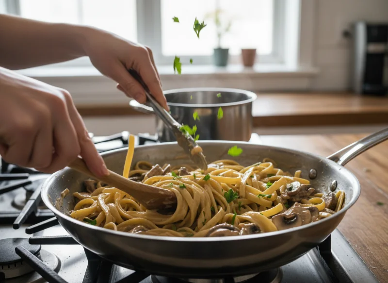 2. Sauté the Mushrooms (Step 2 of 5): While the pasta cooks, heat a tablespoon of olive oil (or water for oil-free) in a large skillet over medium-high heat. Add the sliced mushrooms in a single layer. Let them sit undisturbed for 3–5 minutes until they are golden brown on one side. Stir and cook for another 3 minutes.