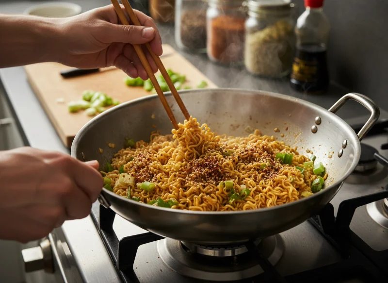 4. Toss and Coat (Step 4 of 4): Add the cooked ramen noodles to the skillet. Use tongs to toss the noodles vigorously in the sauce. The starch in the water will help the sauce emulsify and glaze the noodles perfectly.